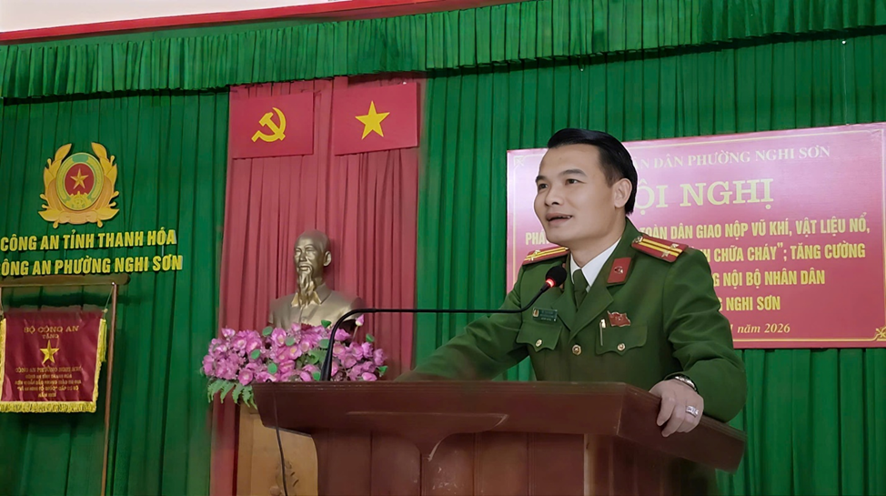 Tại hội nghị, đại diện Công an phường Nghi Sơn đã triển Triển khai Kế hoạch của UBND phường về phòng ngừa, đấu tranh, ngăn chặn và xử lý các hành vi vi phạm về pháo, vũ khí, vật liệu nổ, công cụ hỗ trợ, đồ chơi nguy hiểm trong dịp Tết Nguyên đán Bính Ngọ năm 2026. Nội dung tuyên truyền nhấn mạnh các quy định của pháp luật, nguy cơ mất an toàn và hậu quả pháp lý của việc tàng trữ, sử dụng trái phép vũ khí, vật liệu nổ, pháo, góp phần nâng cao ý thức chấp hành pháp luật trong Nhân dân.
